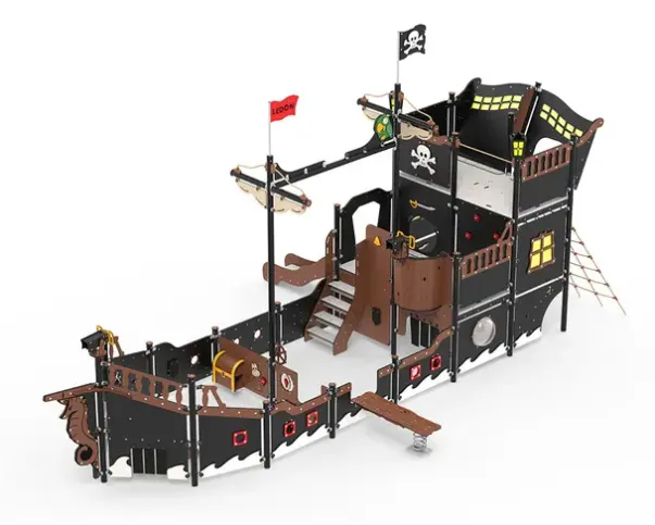 Aktiviteter: Trapp, nett, sklie, kryperør, planke med fjær, plattformer, skattekiste, mast med seil, kabin, bevegelige deler, vinduer, ror, kikkert