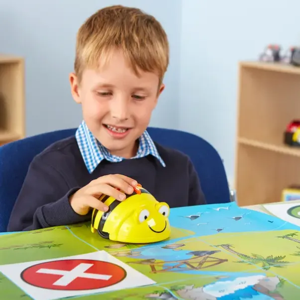 Bee-Bot er en gulvrobot som trener programmering, samarbeid og logisk tenking. Det programmeres enkelt med knappetrykk på toppen. Velg retning og antall trinn. Den forflytter seg i trinn på 15 cm og kan rotere i 90°. Det er mulig å programmere opptil 200 trinn!