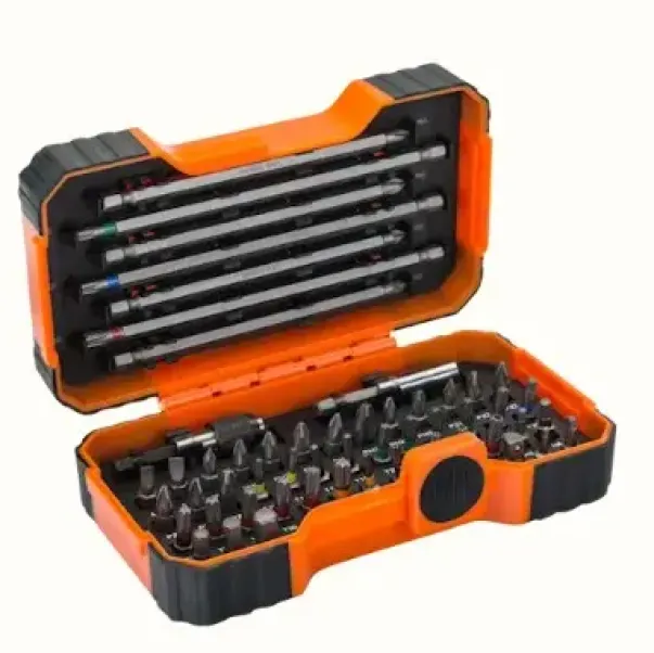 Innholder 54 deler med 1/4″ sekskantfeste laget av sandblåst og oljerustbeskyttet stål i høy kvalitet, 51 bits, 2 magnetiske bitsholdere hvor en har hurtigavløser og et hylseadapter. 1/4″. 25 mm bits: spor 4,5 og 5,5 mm, Phillips PH1, PH2x4, PH3 og PH2Gx2, Pozidrive PZ1, PZ2x4 og PZ3, Torx T10x2, T15x2, T20x4, T25x2, T27, T30x4 og T40, Torx med midtpunkt TR10, TR15, TR20, TR25 og TR30, Insex 3, 4, 5, 6 og 8 mm, Robertson nr 1 och nr 2. 125 mm bits: Phillips PH1 og PH2, Pozidrive PZ1 og PZ2. 150 mm bits: Torx T20, T25 og T30.