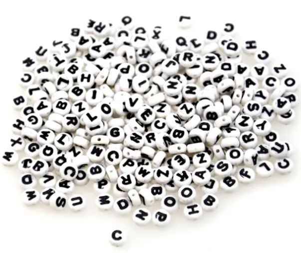 Flate og runde perler med bokstavtrykk.