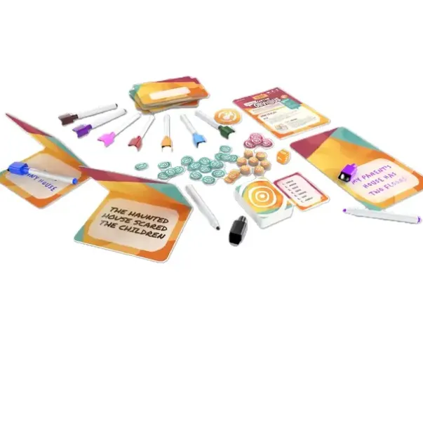 To play, reveal the round’s current word and sentence length. In secret, each player writes a sentence on their board, then passes their board to the next player, who removes one word — other than the current word — from the sentence. In turn, each player reads out their sentence while others try to guess what the missing word is.
