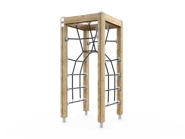 Materiale: Ramme av finsk PEFC-sertifisert furu, stolper av impregnert limtre. Stolpene er ikke i kontakt med bakken, men er forankret med stål. Metalldelene er bhandlet med Lappcoat, en overbehandling spesielt laget for å beskytte metalldeler på lekeplassutstyr. Stålforsterket tau.
