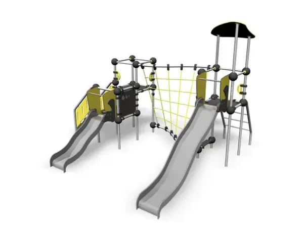 Materiale: Varmgalvanisert stål, stålforterket klatretau, HPL-plater og galvaniserte stålføtter