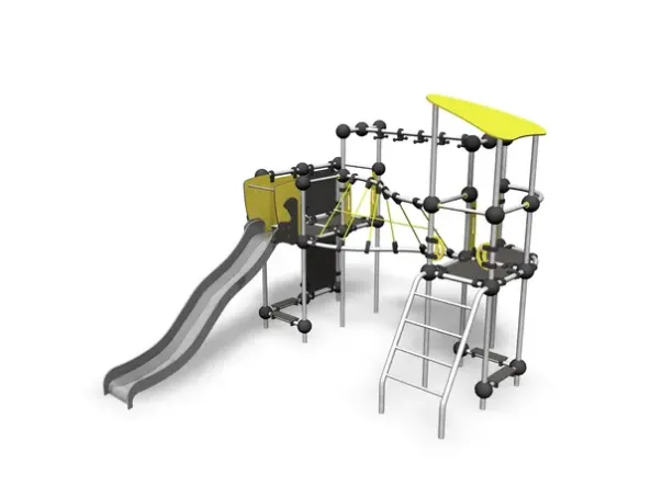 Materiale: Varmgalvanisert stål, stålforterket klatretau, HPL-plater og galvaniserte stålføtter