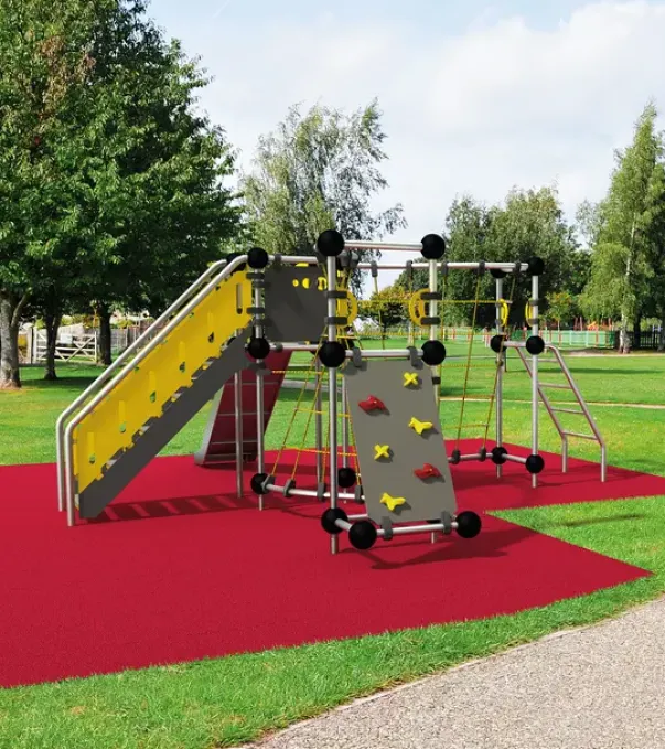 Materiale: Varmgalvanisert stål, stålforterket klatretau, HPL-plater og galvaniserte stålføtter