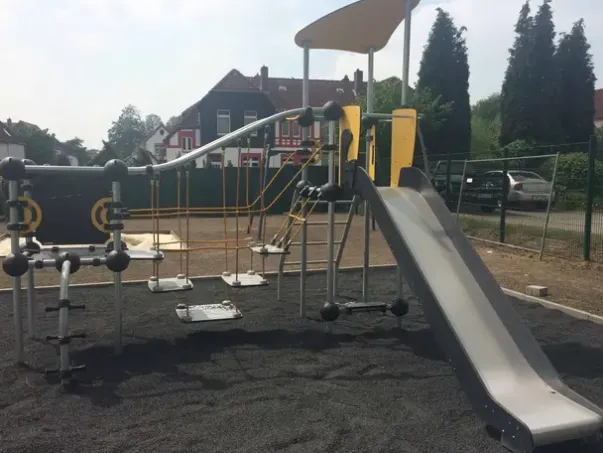 Materiale: Varmgalvanisert stål, stålforterket klatretau, HPL-plater og galvaniserte stålføtter