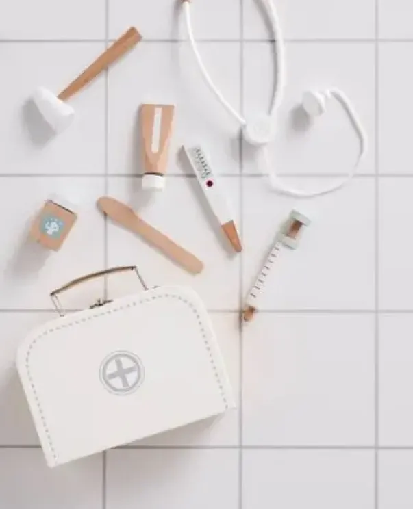 Innehold: 1 x bære veske, 1 x sprøyte, 1 x termometer, 1 x stetoskpo, 1 x tube, 1 x boks, 1 x tungespatel og 1 x reflekshammer.