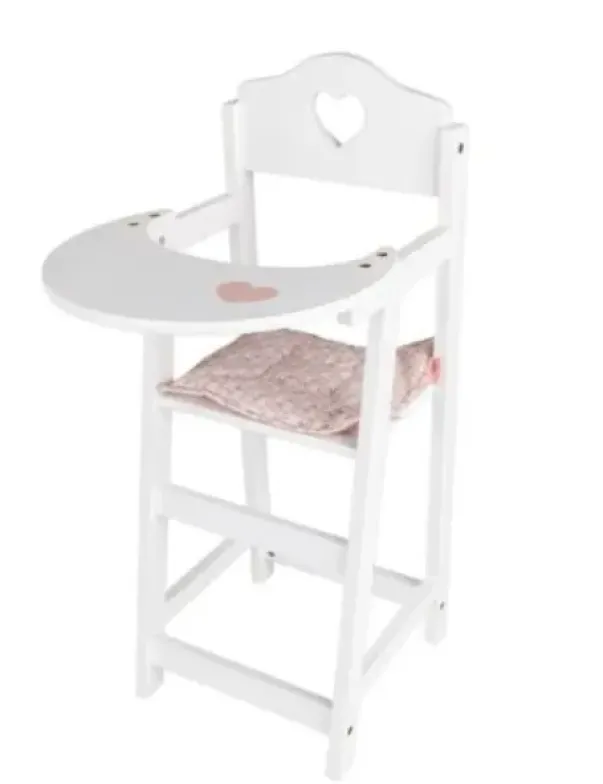 La dukken din sitte pent ved bordet i denne søte høye stolen. Da blir det enkelt å gi dukken din mat i fred og ro. Egnet til dukker på opptil 50 cm.