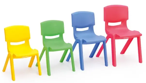 Stabile plast barnestoler i solid plast. 8 stykker kan stables på hverandre.