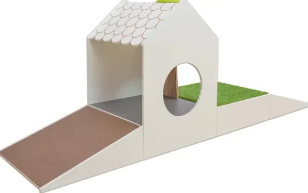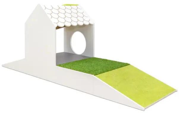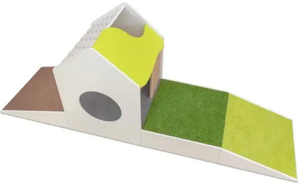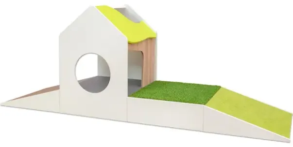 Educasa Bruno podiesett består av fire forskjellige plattformer inkludert lekehus som blir en liten oase for ro, leke og skjule. Lekehuset inviterer til både rollelek og kosestunder. Plattformen med kunstgress er ideell for barnas følesans og de kan klatre, skli og krype på de to rampene.