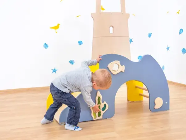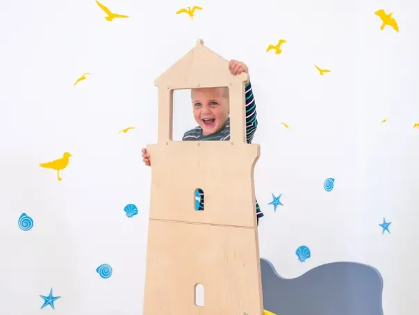 Fyrtårnsklien vil bli barnas favoritt på kort tid! De mange detaljene rundt fyrtårnet inviterer barna til å utforske og leke med fantasien. Transparente akrylglasspeil, kikkehull, taktile- og føleelementer som består av en snegle til å vri rundt, en søt fisk med speil og tang med teppe, linolium og kunstgress. Fyrtårnet er er 140 cm høyt og har et robust vindu av ackrylglass.