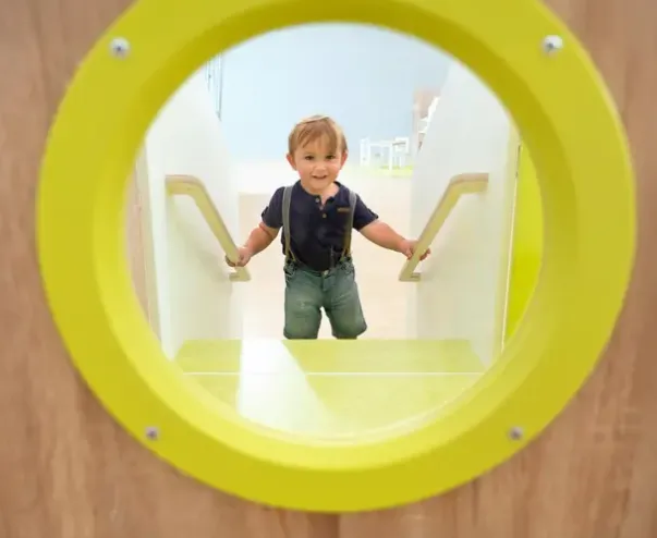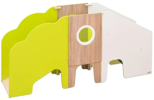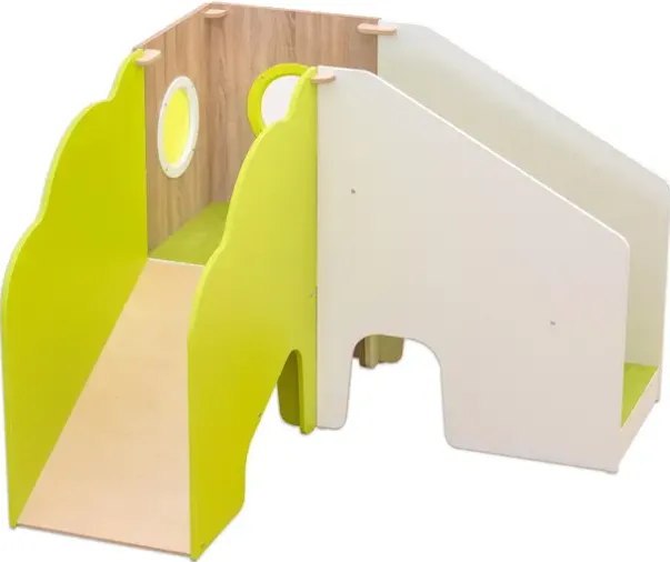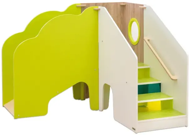 Educasa lekeborg står stabilt på gulvet etter at det er satt opp. Trappen med rekkverk på begge sider passer for de minste. Vinduene er laget av akrylglass.