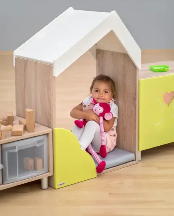 Educasa lekehus mini er et lite koselig hus som kan stå fritt i et rom eller mellom to hyller. Denne passer fint inn i et miljø sammen med Educasa reolsystem. Huset gir barna følelsen av trygghet. Her kan de krype inn under et godt teppe med en bamse og en spennende bok eller den kan bli en del i en rollelek. Taket og buskene på sidene av huset gjør dette til et koselig og lunt sted og oppholde seg. Madrass kan bestilles separat.