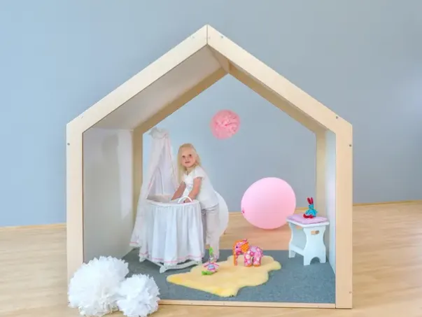 Huset er tilgjengelig fra to sider og har en takhøyde som gjør at voksne også kan oppholde seg i huset. Dette kan bli til et dukkehus, musikkrom, eller et malehus – her er det kun fantasien som setter grenser! Det barnevennlige designet passer godt sammen med et hvert interiør. Gulvet i huset er dekket av et slitesterkt, lettstelt og lyddempende teppe.