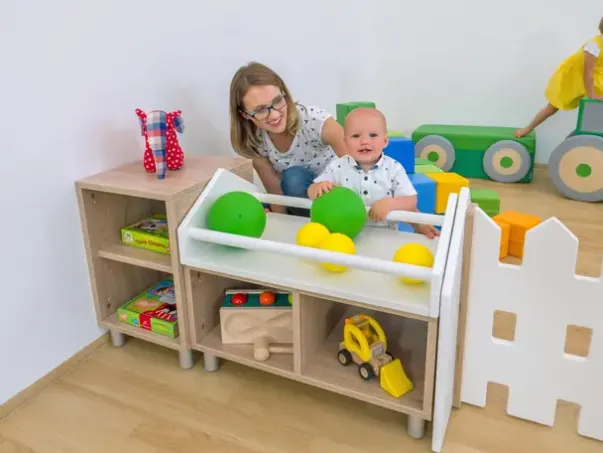 Educasa lekehylle med håndtak passer fint til de miste barna som trenger noe å holde seg fast til. Her har de noe å holde seg fast til imens de står å leker. For at denne skal stå sikkert må den skues fast til reol. Denne passer fint til Educasa reolsystem 2 rom, se varenr B4174X.