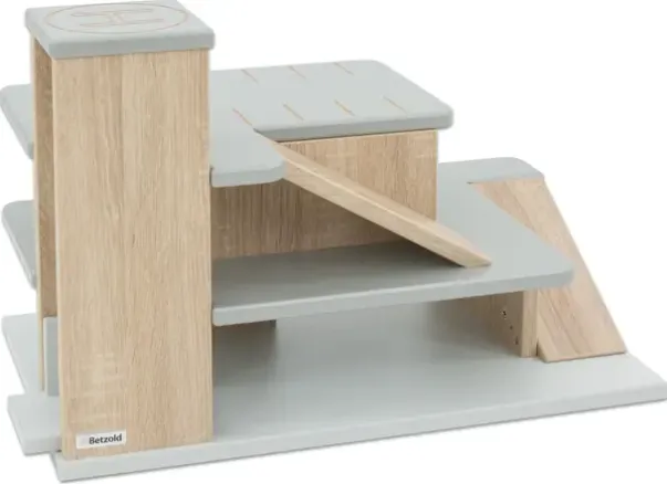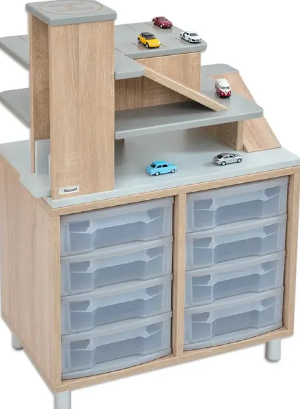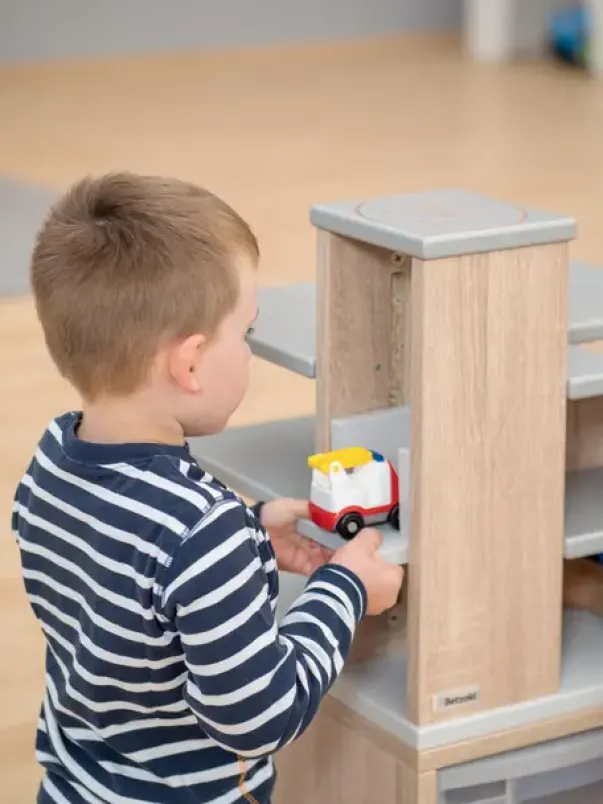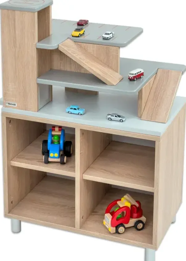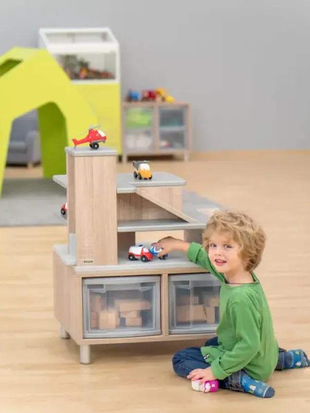Parkeringshuset har heis og kan skrues fast i reol for at den alltid skal stå trygt og sikkert. Heisen trener motoriske ferdigheter på en leken måte ved å måtte flyttes med to hender. Mellom de forskjellige parkeringsnivåene er det ramper der barna kan kjøre lekebilene fra etasje til etasje.