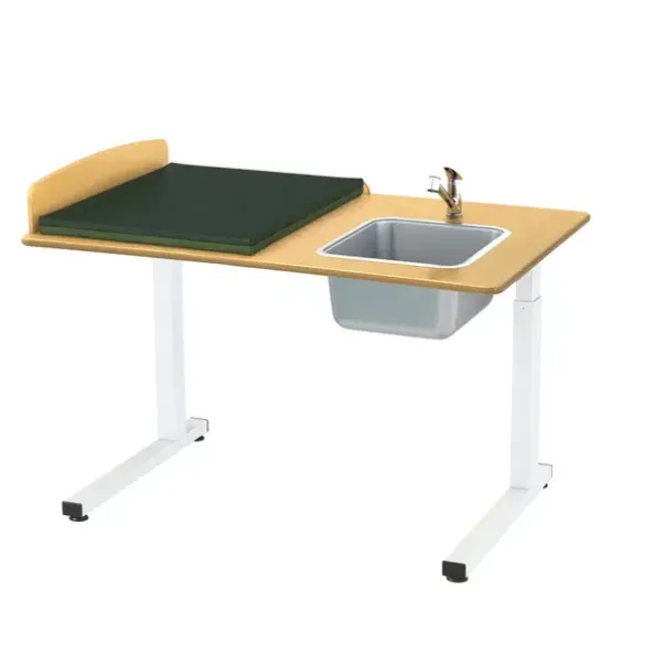 Ella er en serie med elekstrisk heve og senk funksjon hvor man enkelt kan tilpasse arbeidshøyden etter behov. Justeringen fungerer enkelt med en håndkontroll med spiralkabel. Med styreenheten senkes lett stellebordet slik at barn kan klatre opp på stellebordet uten å løftes. Når det er gjort kan du raskt og enkelt stille inn den arbeidshøyden du ønsker. Med avrundede hjørner på sidevanger og bordplaten. Stellebordet leveres komplett inkludert stellepute, vask i rustrfritt stål, ett-greps blandebatteri og avløpsdetaljer