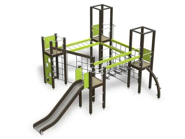 beiset med UV-bestandig beis. Metalldelene er meget slitesterke og har enutsøkt finish. De er behandlet med Lappcoat, en overflatebehandling spesieltlaget for å beskytte metalldeler på lekeplassutstyr. Tauet er stålforsterket.Stolpene er ikke i kontakt med bakken, men er forankret med stål.