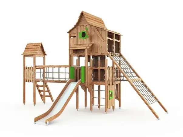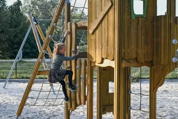 Funksjoner: Aktivitetsapparat med et lite og et stort leketårn, sklie, klatrenett og balanseelementer