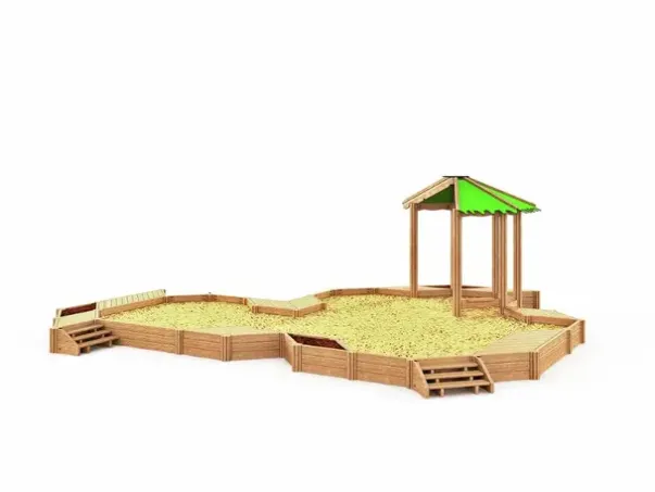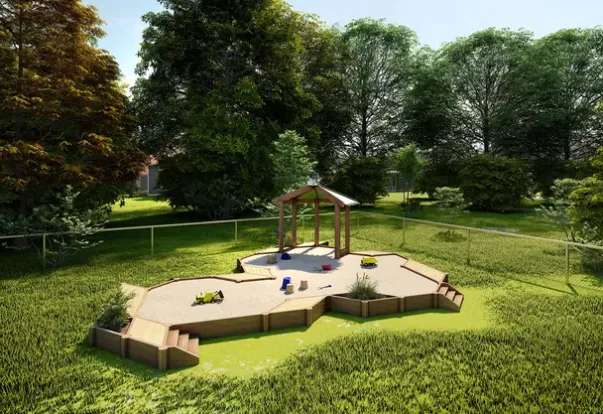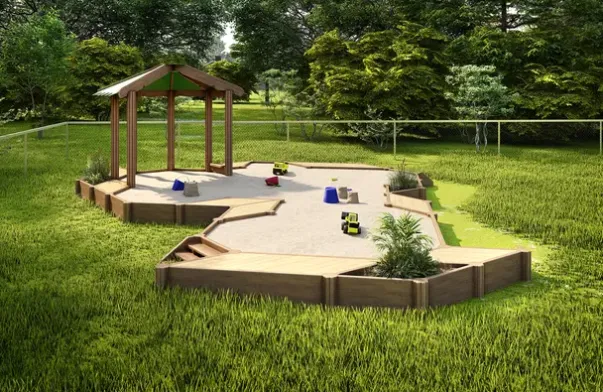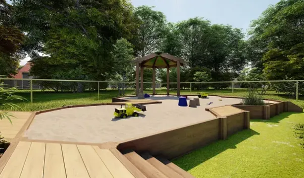 Funksjoner: Sandkasse med lekehus, platting, plantekasse, sosial sone