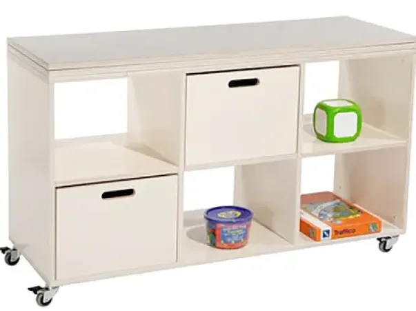 Laget av 18mm hvitpigmentert bjerkefiner av fineste AA kvalitet. Bordplaten er laget av samme materiale, men har en slitessterk høytrykkslaminat på toppen. Alle hjulene har brems. Kan leveres med flere typer skuffer. H 73 x L 123 x D 45. Dybde bord utslått 90cm.