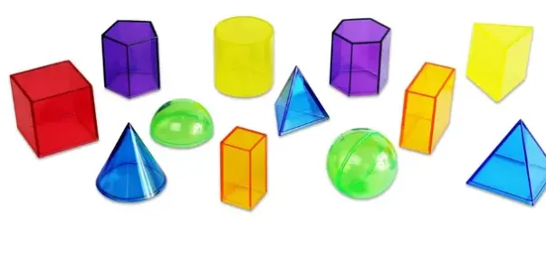 Inkludert er en kube, stort rektangulært prisme, lite rektangulært prisme, trekantet prisme, trekantet pyramide, firkantet pyramide, sylinder, kule, halvkule, kjegle, femkantet prisme og sekskantet prisme.