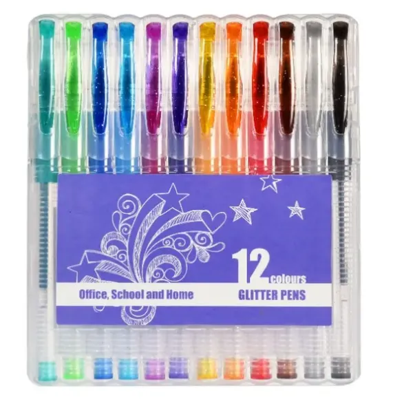 Glitterpenner med 1mm metallspiss i praktisk selvstående etui som gjør det enkelt å finne riktig farge. Det forhindrer også at pennene havner på gulvet og blir borte. Etuiet inneholder 12 flotte glitrende farger, som dekker godt og gir et flott resultat.