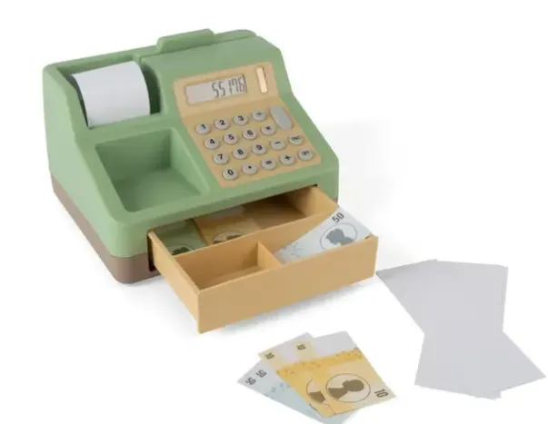 Inkluderer: kasseapparat som kan åpnes, solcelledrevet kalkulator, papirpenger og kvitteringer. Scannerfunksjon