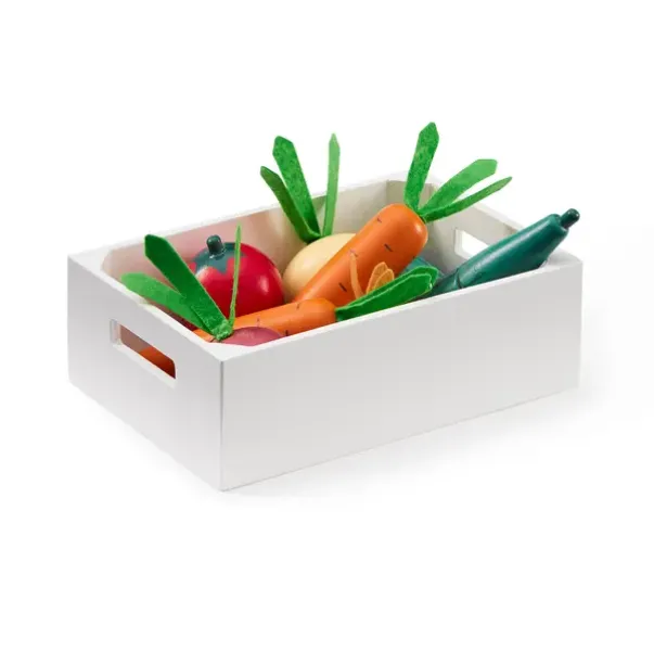 Størrelse: Grønnsakskasse 18x12x5,5 cm, gulrot, agurk: 10cm, tomat, kålrot, løk, rødbeter, sitron Ø4,5 cm.