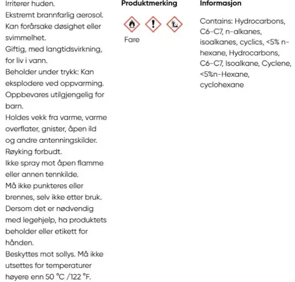 Løsemiddelbasert. Tips: Spray utendørs eller ha god ventilasjon inne. Flere tynne lag (istedenfor ett tykt) gir bedre resultat. La tørke mellom hvert lag. Avstand 20-30 cm. Boks med 150 ml.Gull