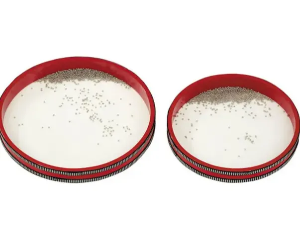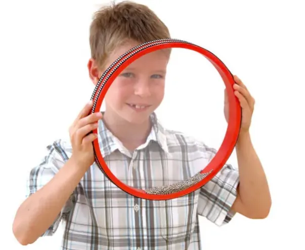 Trommen er laget av gjennomsiktig materiale på begge sider, og har små stålkuler i mellom. Størrelse: 25 cm i diameter.
