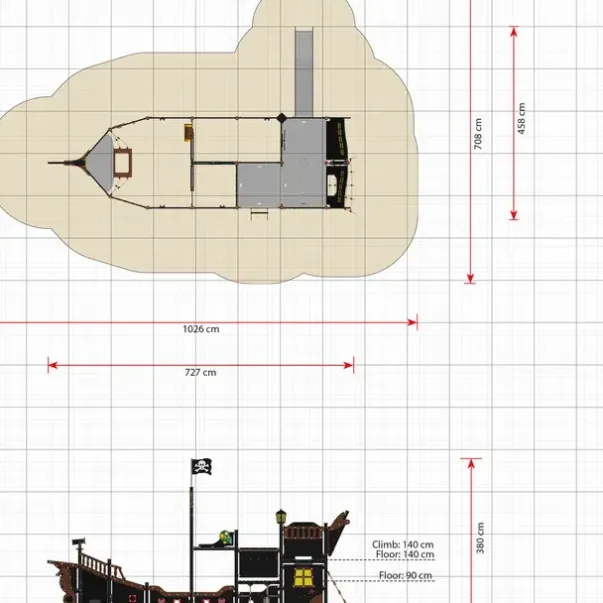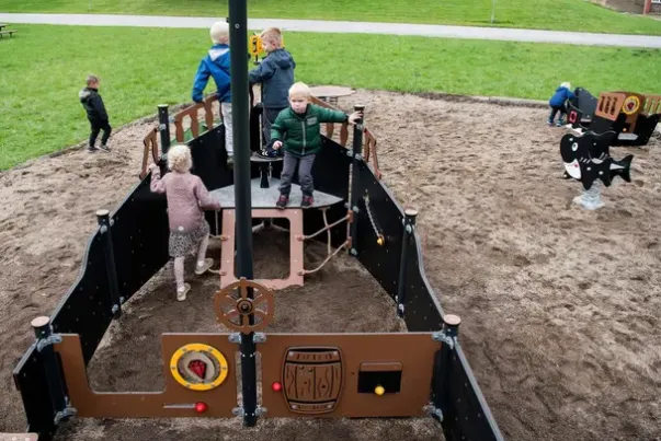 Aktiviteter: Taustige, nett, sklie, plattformer, skattekiste, mast med seil, kabin, bevegelige deler, vinduer, ror, kikkert