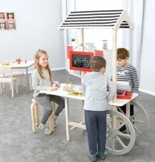 Koselig kafevogn utført i kryssfiner og lamoinert sponplate. Leveres komplett med stofftak og krittavle.