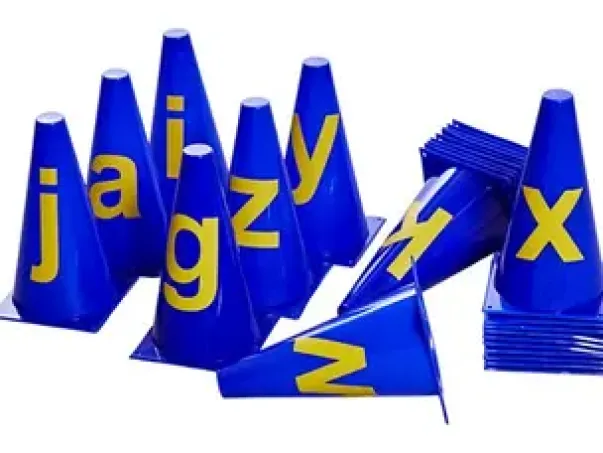 Markeringskjegler med bokstaver. Sett med 26 stk. kjegler. Passer godt til bruk i skole, barnehage og SFO for språkinnlæring og bokstavleker. Høyde: 23 cm.
