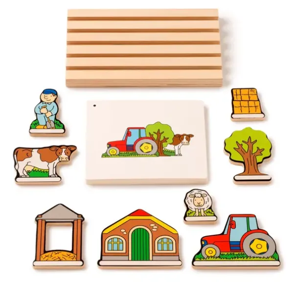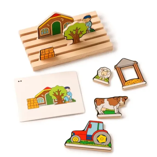 Innhold: Trestativ (L18 x B11 cm), 8 treobjekter, 9 oppgavekort (L13 x B11 cm), instruksjoner, magnetisk oppbevaringsboks (L23 x B21 x H6 cm)