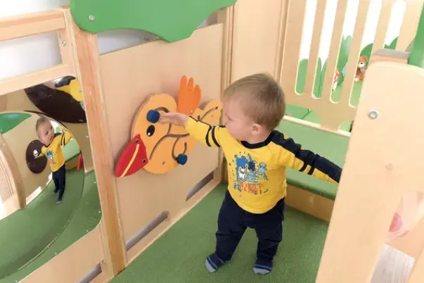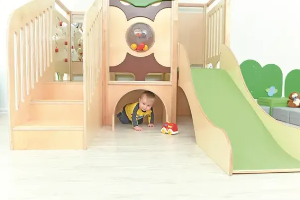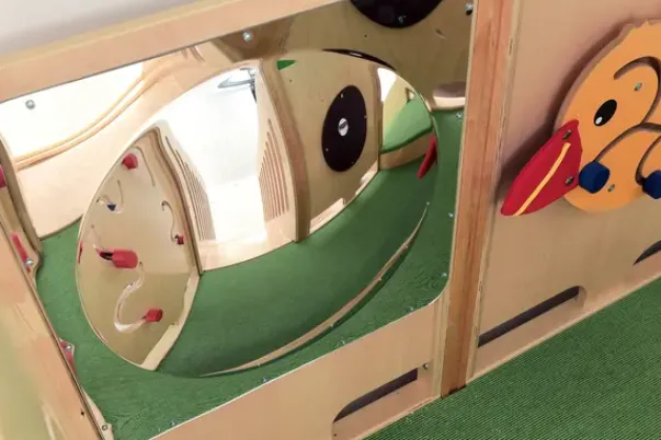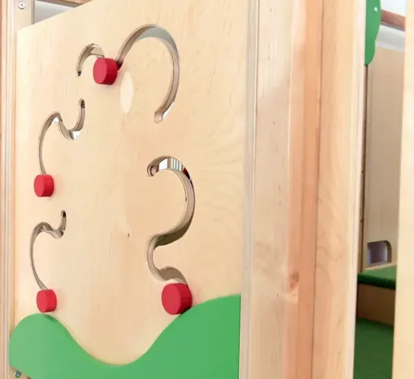 Dette lekehjørne kommer med mange morsomme elementer – sklie, trapper, tunneler, speil, vegglaburinter og vinduskuppek med baller. Det er utført i kryssfiner, tre, laminat og fargerike MDF-plater. Kikkhullet er laget av pleksiglass,