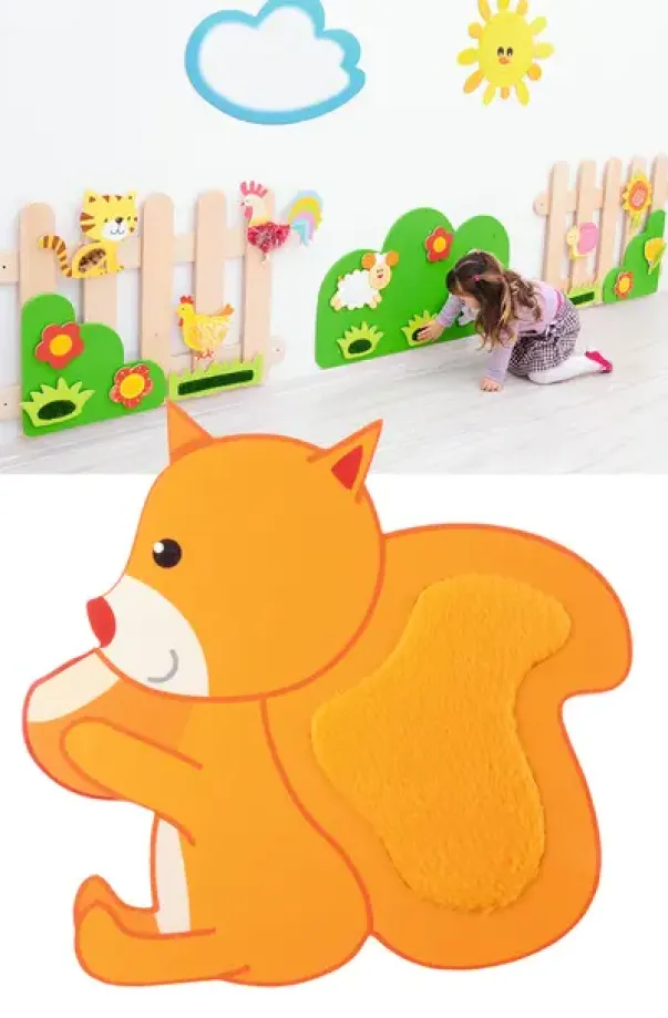 Ekorn av malt finer, som kan festes til lekevegg med magnet. Ekornet har også mykt stoff/pels til å føle på. 24,5×24,5cm