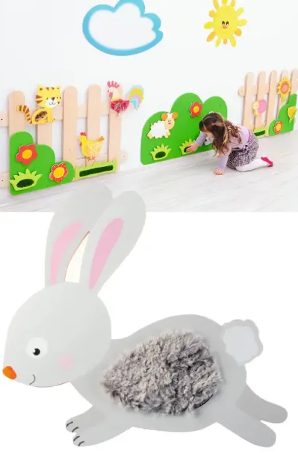 Kanin av malt finer, som kan festes til lekevegg med magnet. Kaninen har myk «pels». 31,5×32,5cm