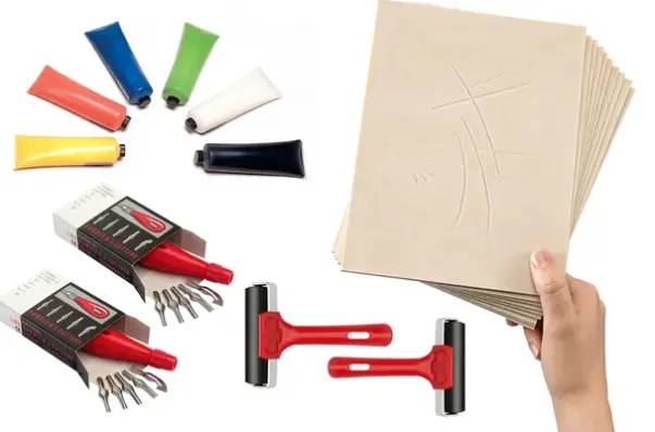 Settet består av kniver, plater; både lino og softcut, rulle og alle seks primærfargene.