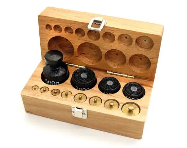 Jernloddene kommer i: 1 x 500g, 1 x 200g og 2 x 100g. Messingloddene kommer i: 1 x 50g, 1 x 20g, 2 x 10g, 1 x 5g, 2 x 2g, 1 x 1g.