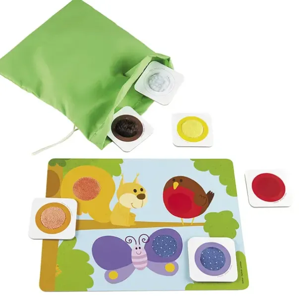Lotto: Hver spilleplate har 3 figurer med ulik overflate. I føleposen kan en føle seg fram til riktig overflate. Gjenkjenne: finn 2 og 2 like spillkort i føleposen. 6 lottobrett (28x21cm) og 18 spillkort (6,5×6,5cm).