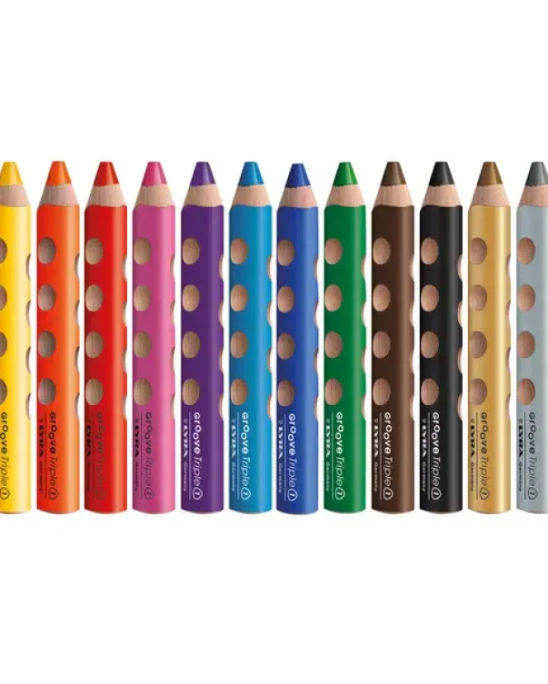 Trekantete blyanter med «grep» for tommel, pekefinger og langfinger. Passer like godt for både høyre og venstre hånd. Her er det kun fantasien som setter grenser! Med disse kan du tegne på papir, men du kan også bruke vann og male oppå, slik at du får en akvarell. Hvis du vil prøve noe nytt, kan du tegne på vinduet, og bruke en pensel med vann til å lage en morsom effekt!