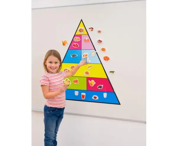 Matpyramiden er magnetisk, slik at den enkelt kan festes på tavlen eller andre overflater. 50 magnetiske brikker med bilder av ulike mat- og drikkevarer er inkludert.