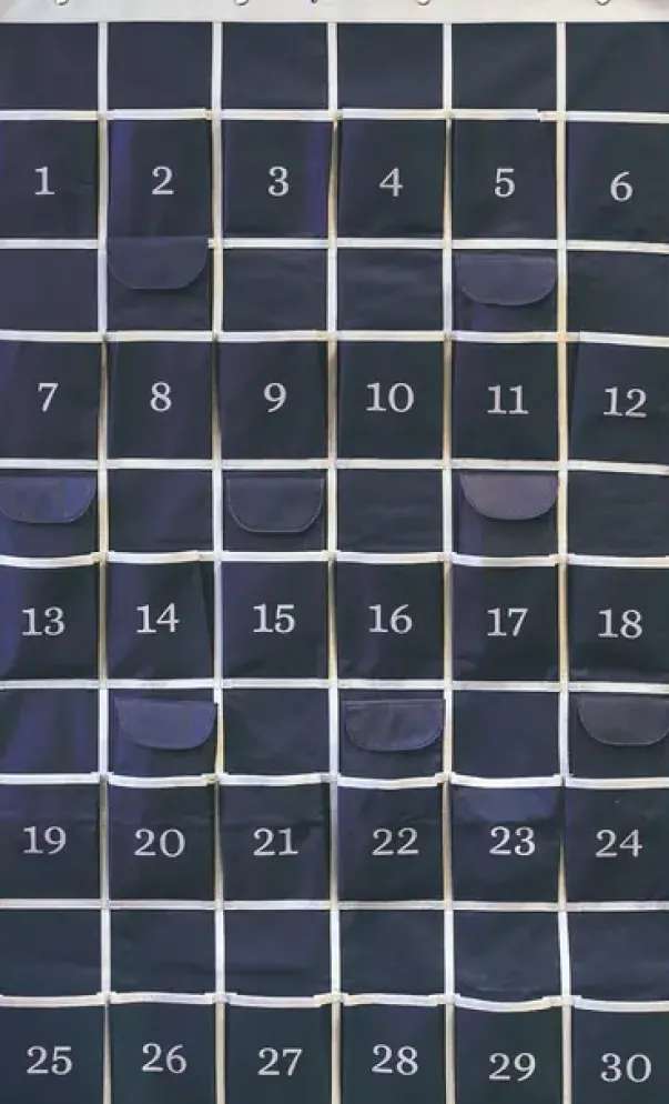 Hotellets oppbevaringsrom er nummerert fra 1–30 og har 4 metallringer for enkel oppheng. Laget av slitesterkt polyesterstoff i mørkeblått.