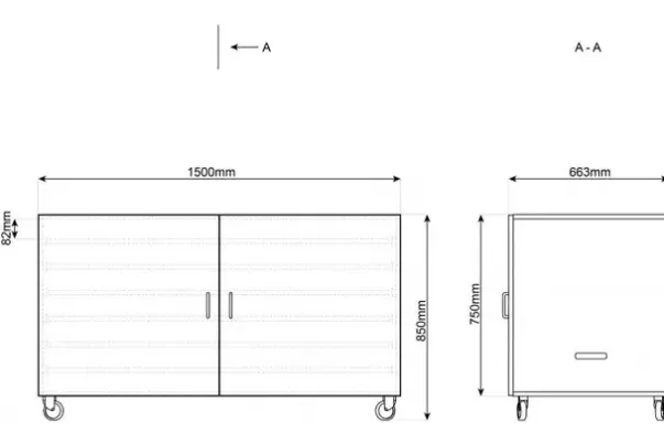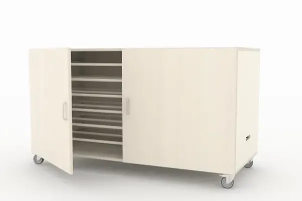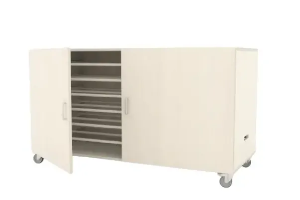 Madrass skap i hvitpigmentert kryssfiner av bjerk. Leveres med 4 solide låsbare hjul.