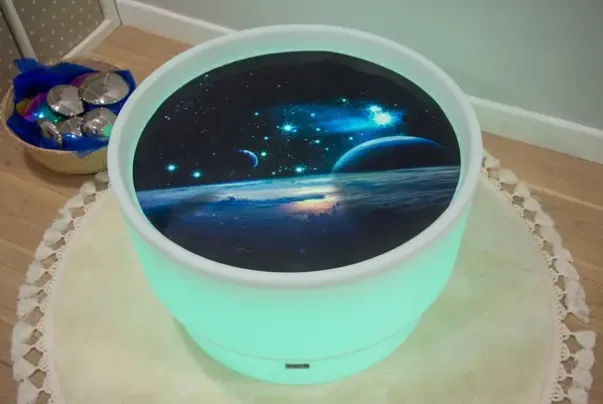 Laget av polyester, matten er slitesterk, vanntett og trygt å bruke med våte eller tørre materialer. Den halvgjennomsiktige lekematten fungerer spesielt godt på en lyspanel eller stemningsbord som lyset lyser opp landskapet. Bruk forskjellig lysfarger og effekten av bildene på matten vil endre seg eller intensivere noe, eller til og med ser ut til å lage enkelte områder fluorescerer – en fascinerende måte å utforske farger.
