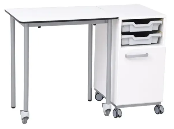 Arbeidsstasjon med krivebord/pult laget i slitesterk CDF og oppbevaringsmodul i laminert spon.