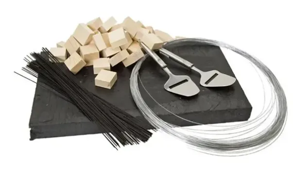 Pakken inneholder: 5 kg sort ostevoks, 2 ostehøvler, 100 m. galv. ståltråd, ca. 72 trådstenger á 60 cm og 50 treføtter.