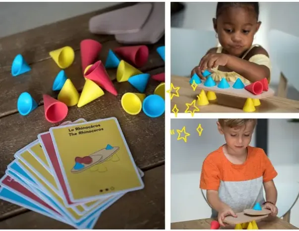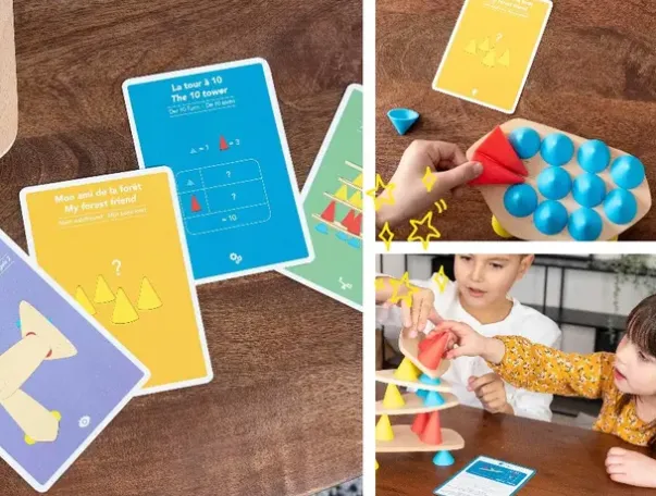 3 – Proporsjoner og ekvivalenser:Proporsjoner er et viktig konsept å forstå og utforske.Med denne kategorien vil barn kunne utfordre dette aspektet, finne ekvivalensene mellom brikkene og dermed finne de passende løsningene for å lykkes med å reprodusere kortene.