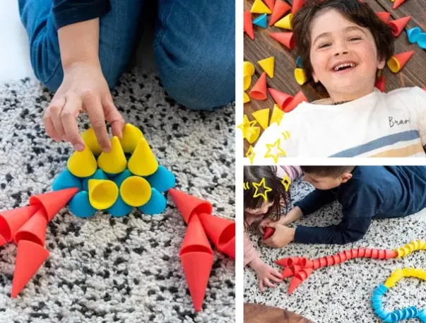 Kjeglesettet, akkurat som Piks balansespill, er et kreativt spill. Barn oppdager teksturer, manipulerer kjegler og utvikler sine finmotoriske ferdigheter ved å lage alle typer figurer fra fantasien eller fra foreslåtte modeller!